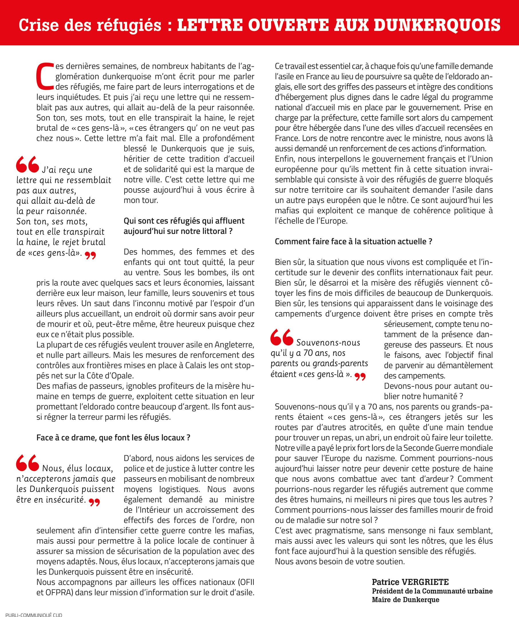 Cette lettre m’a fait mal. Elle a profondément blessé le Dunkerquois que je suis, héritier de cette tradition d’accueil et de solidarité qui est la marque de notre ville.